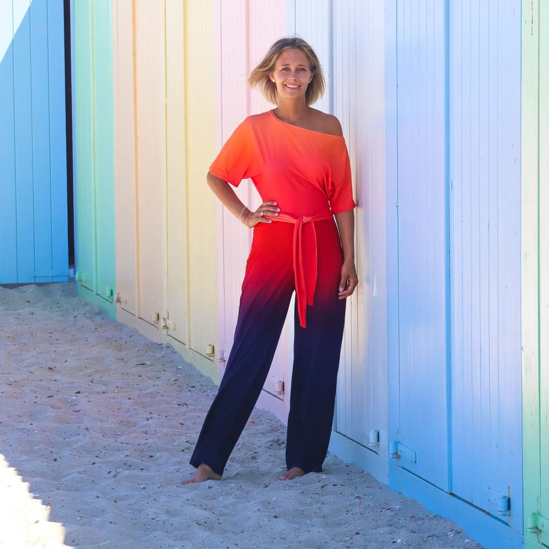 Mars is a sophisticated off-shoulder jumpsuit with wide legs that make it the perfect companion for hot days. The asymmetrical cut of the top is a real eye-catcher. Mars is combined with a sewn-in waist belt.