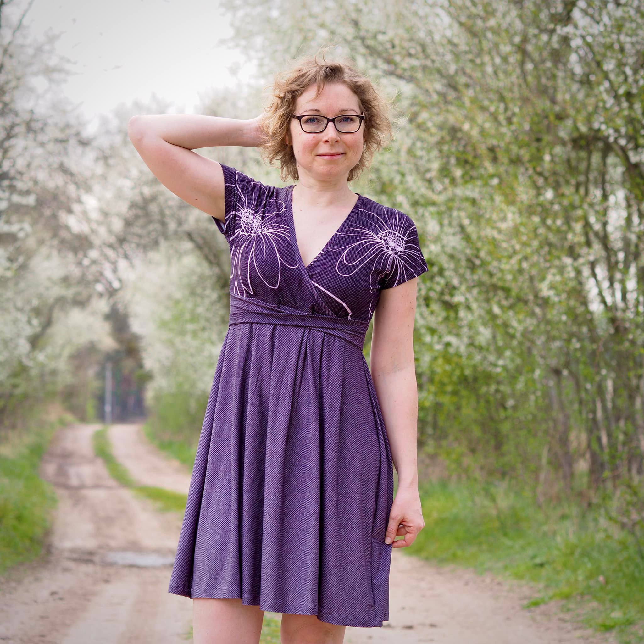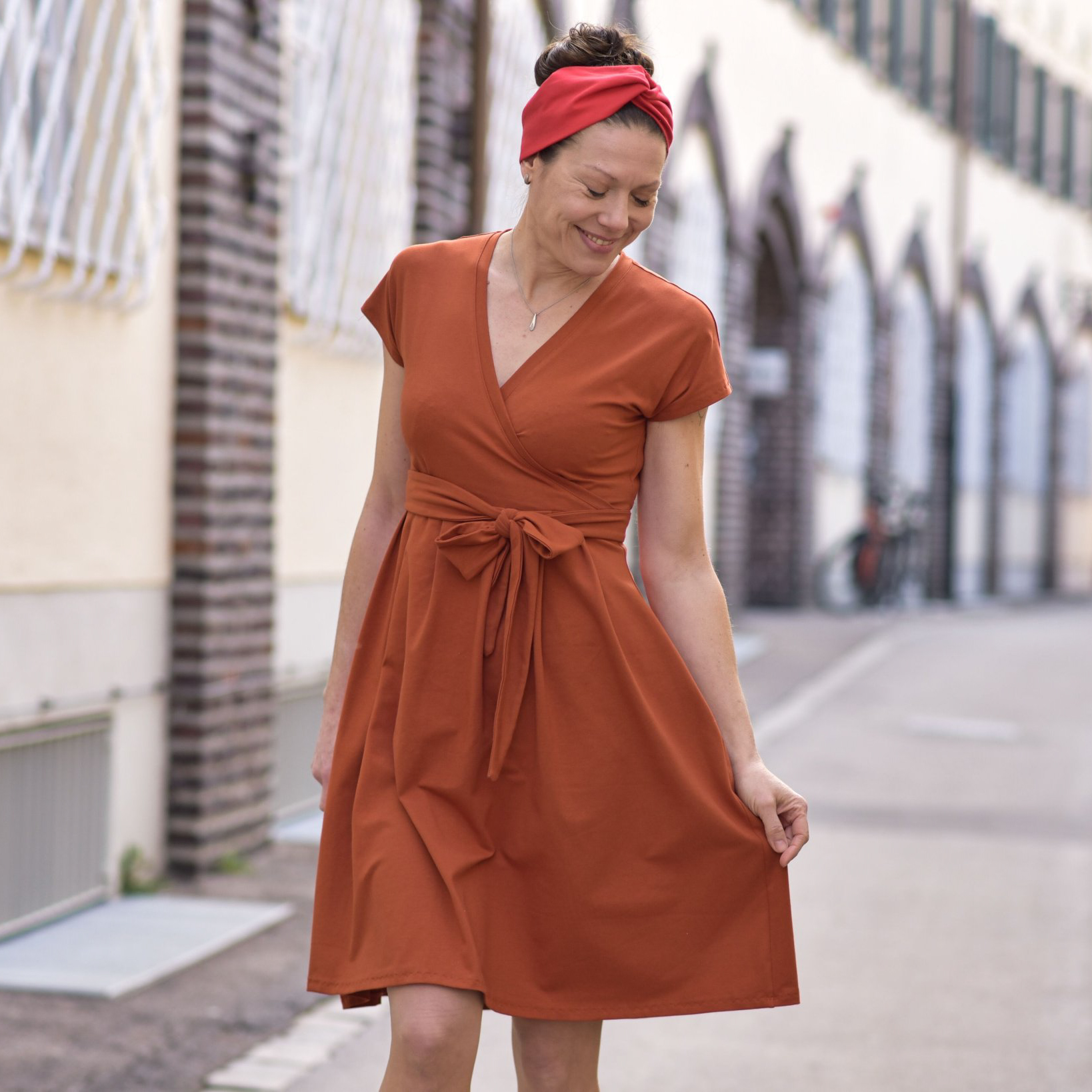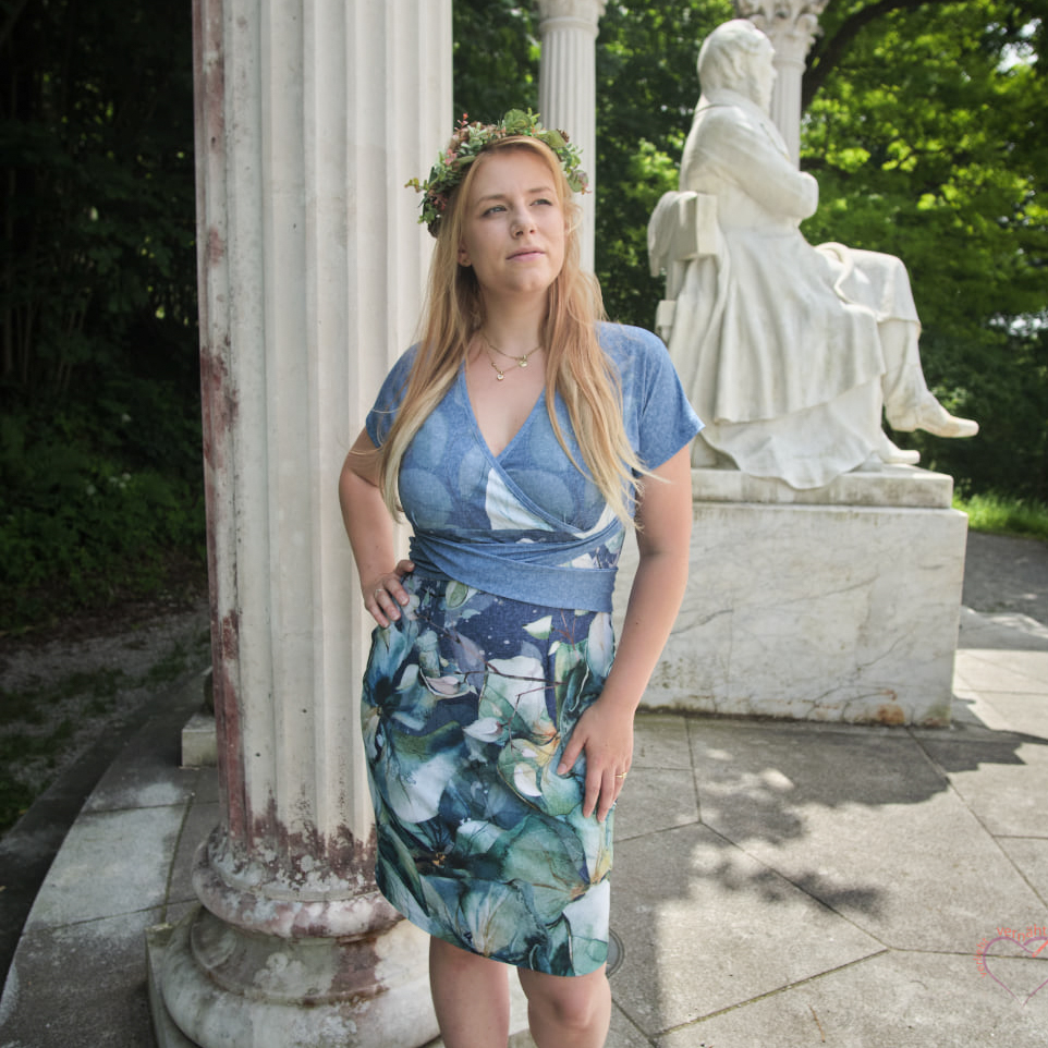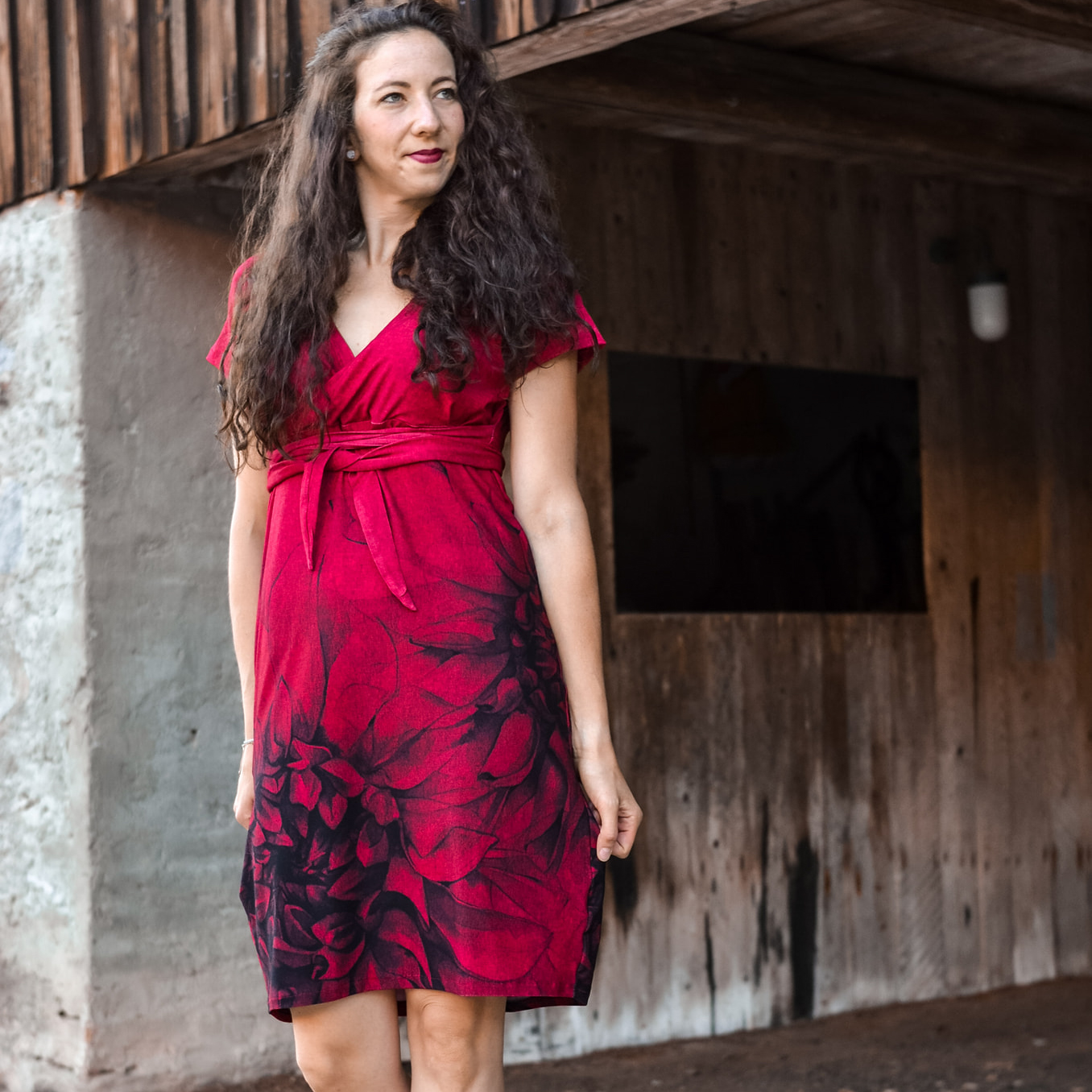Hera is an elegant and comfortable summer dress in two versions: with a tight skirt and a swinging pleated skirt. The top forms a beautiful décolleté with small pleats and darts. The top ends under the breast and its shape is underlined again with a sewn-in tie belt. With the free sleeve add-on, Hera is the perfect companion even in the colder seasons.