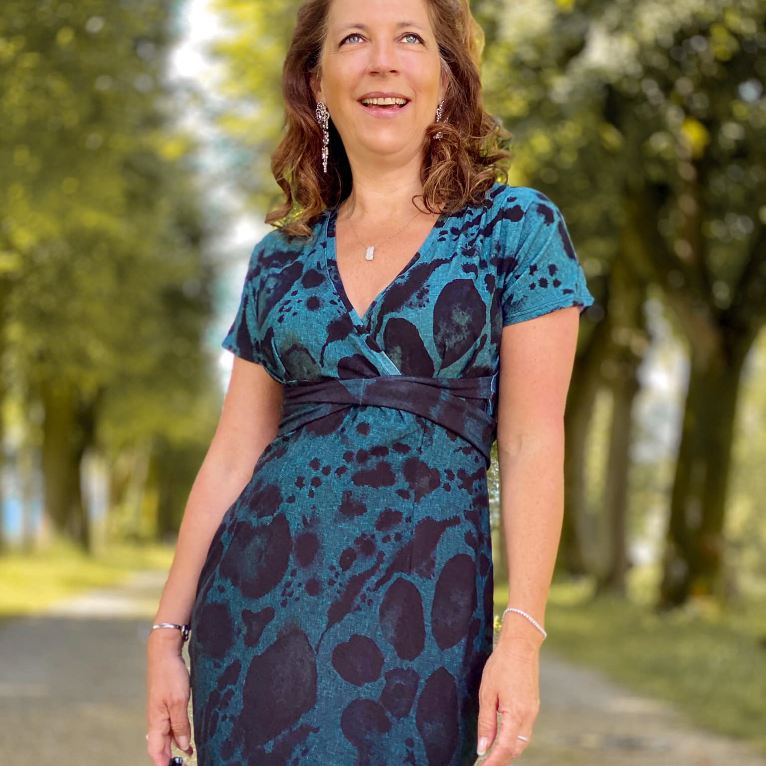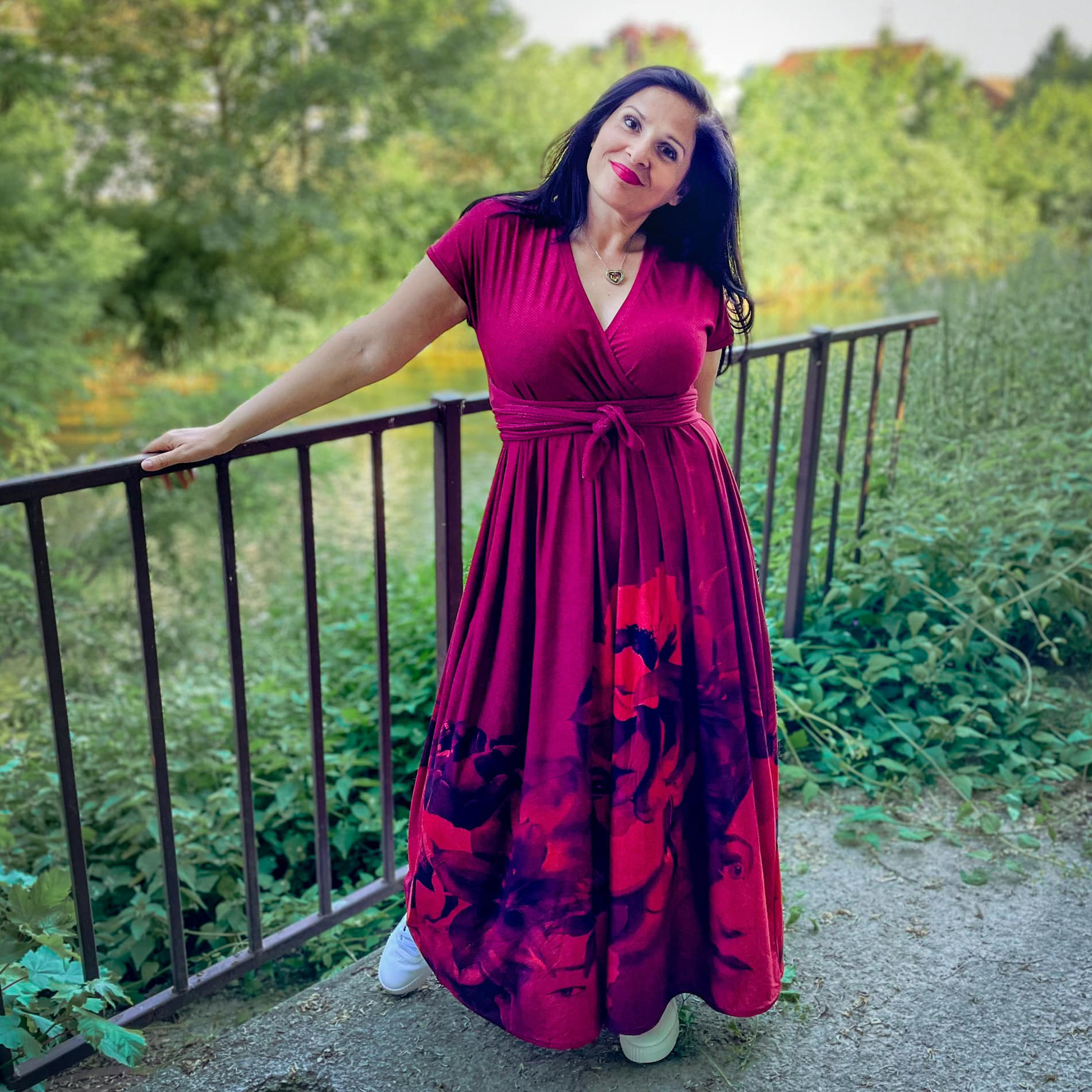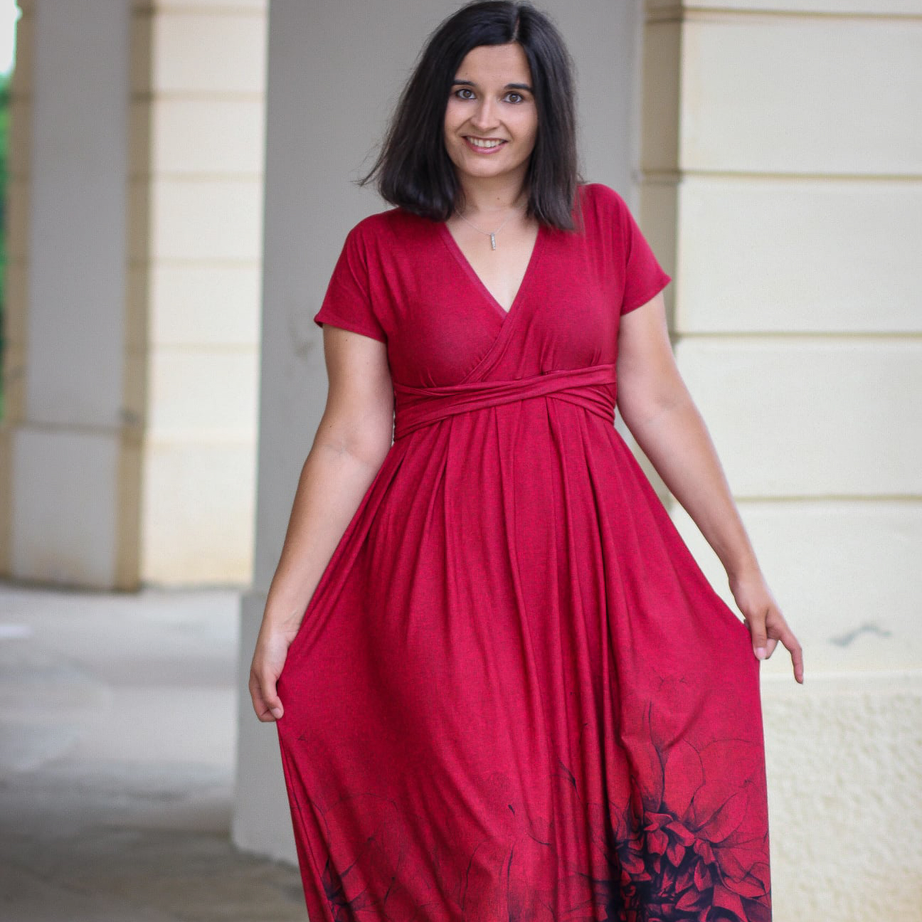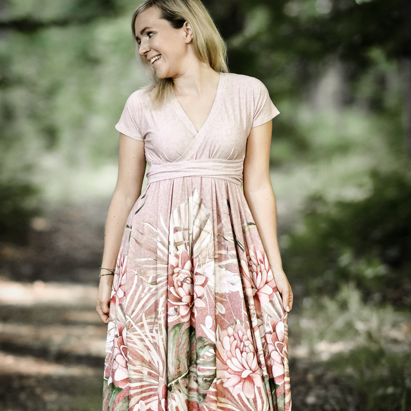 Hera is an elegant and comfortable summer dress in two versions: with a tight skirt and a swinging pleated skirt. The top forms a beautiful décolleté with small pleats and darts. The top ends under the breast and its shape is underlined again with a sewn-in tie belt. With the free sleeve add-on, Hera is the perfect companion even in the colder seasons.