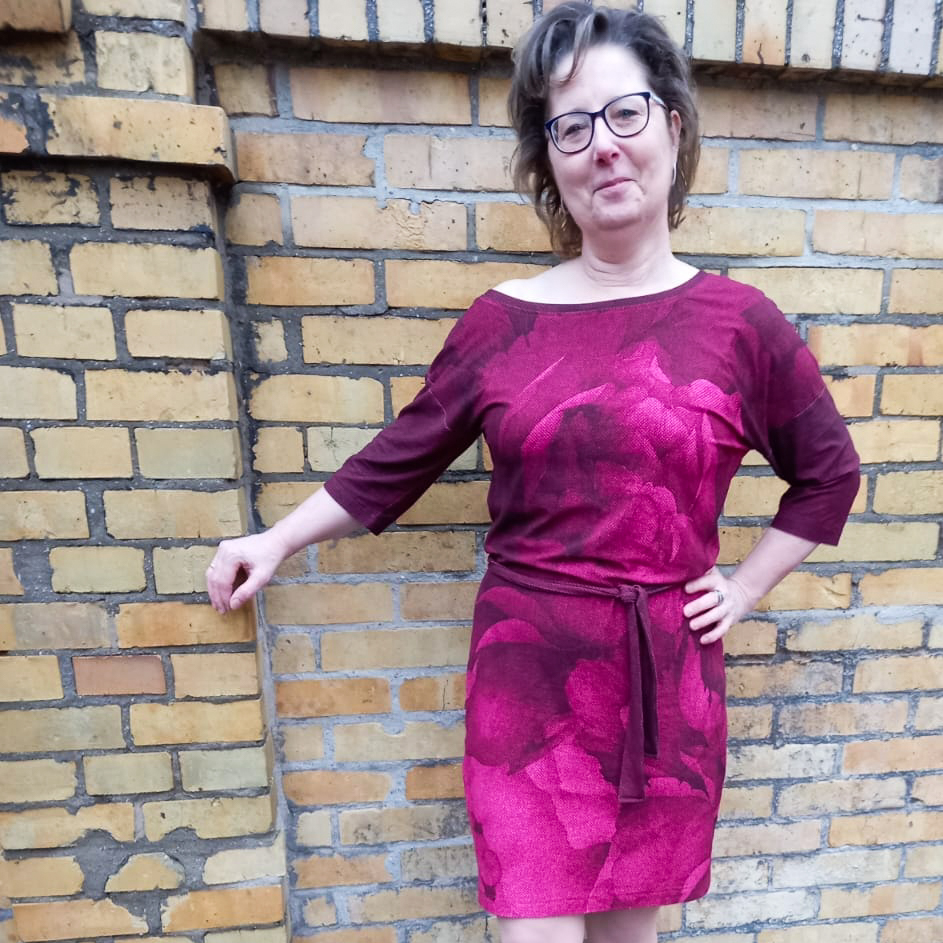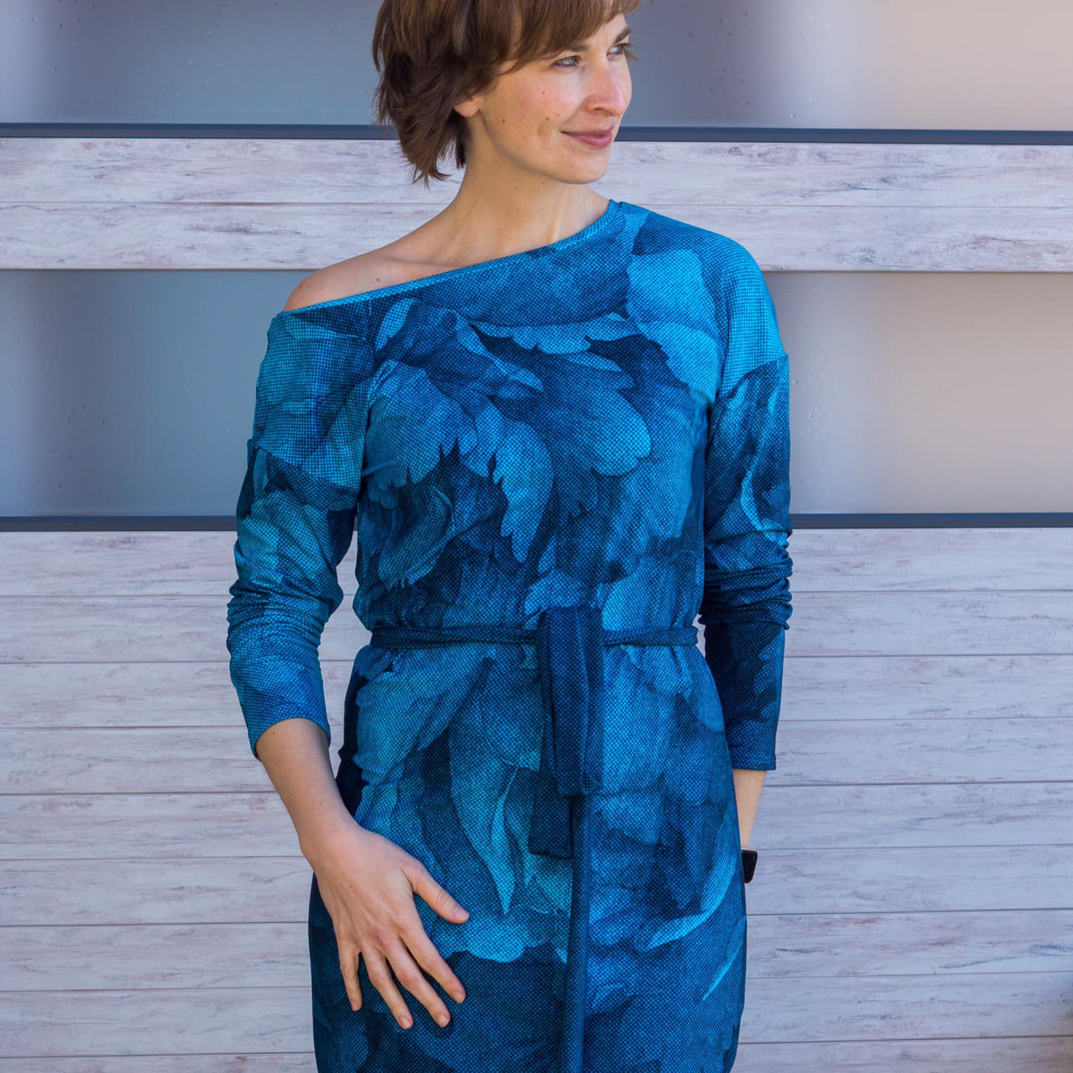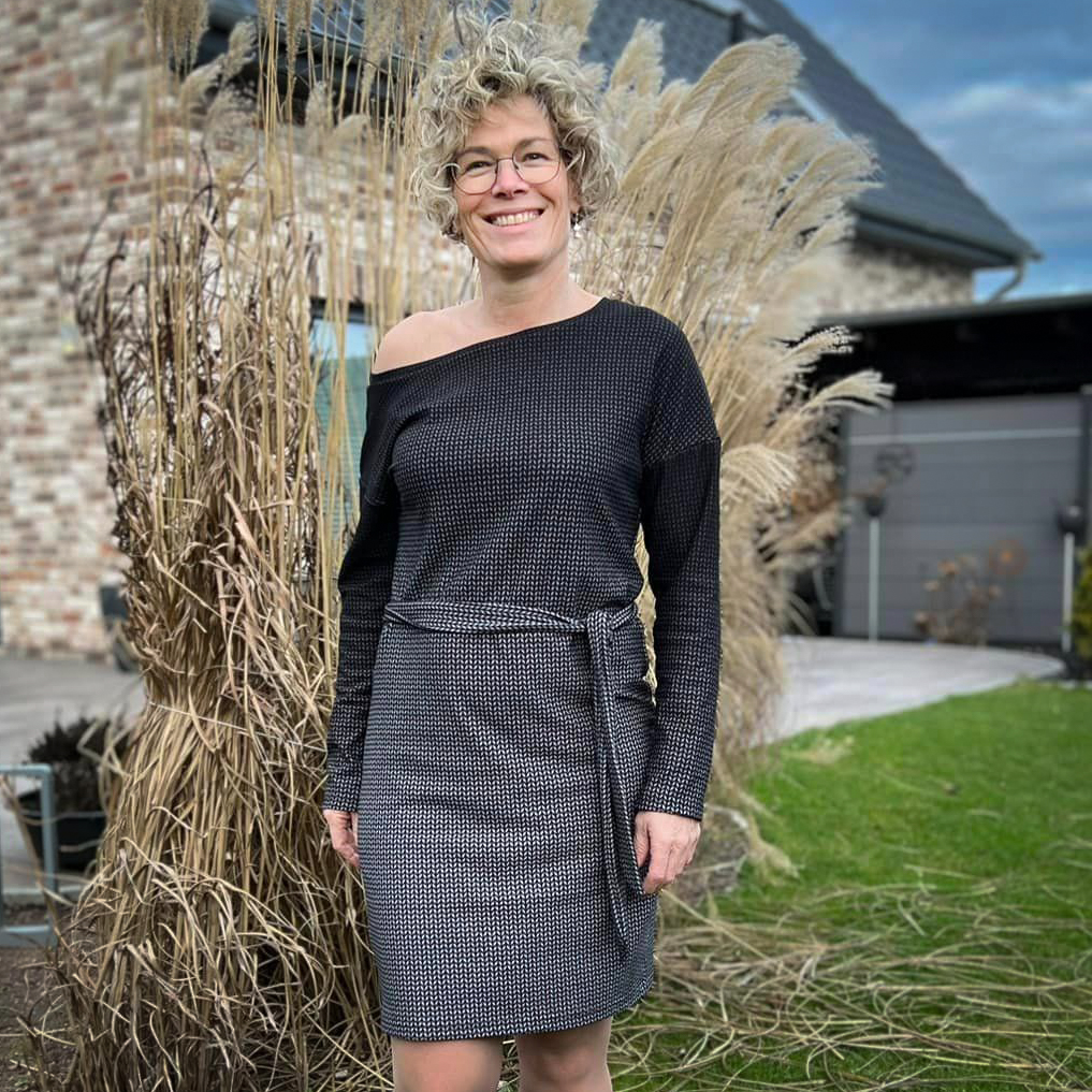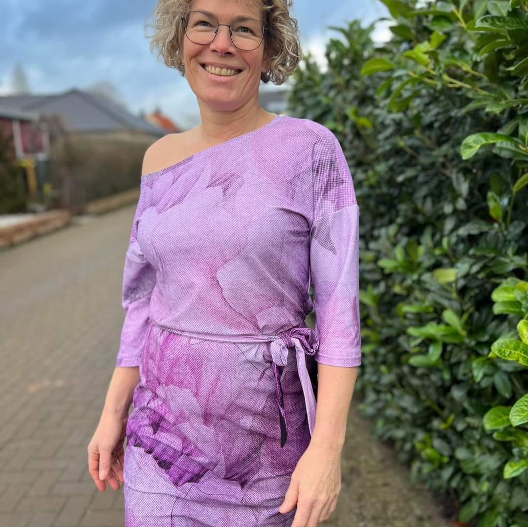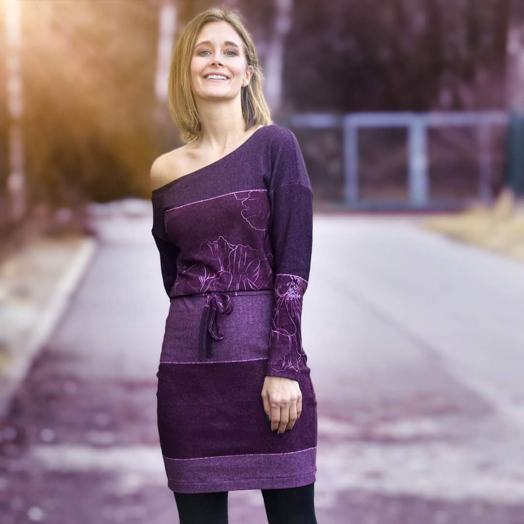 “Pluto” is a quickly sewn, comfortable dress that can be worn in the warm and cold seasons. The special extra is the asymmetry, the dress can be worn off the shoulder on one side. You also have the choice between long and 3/4 sleeves.
