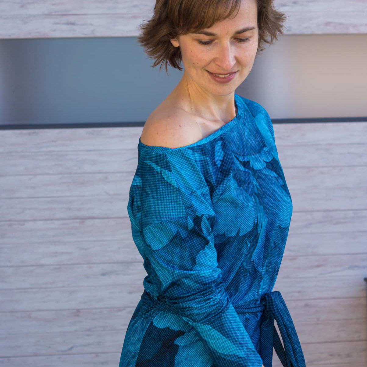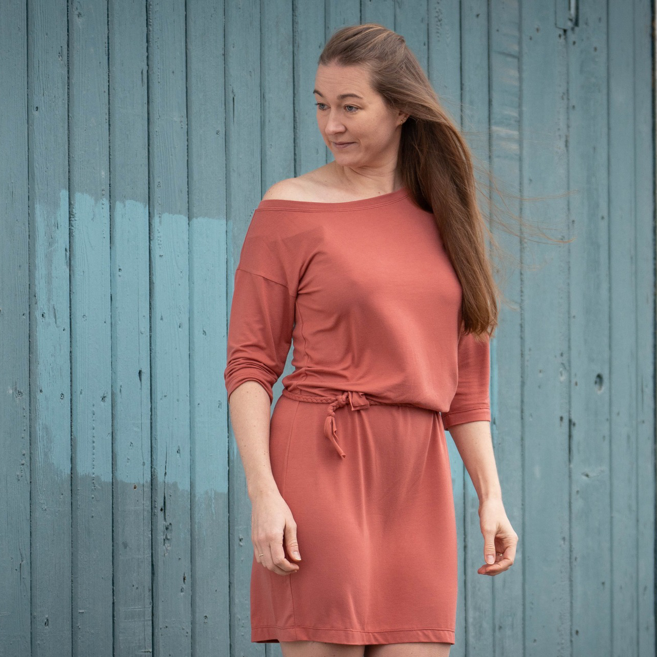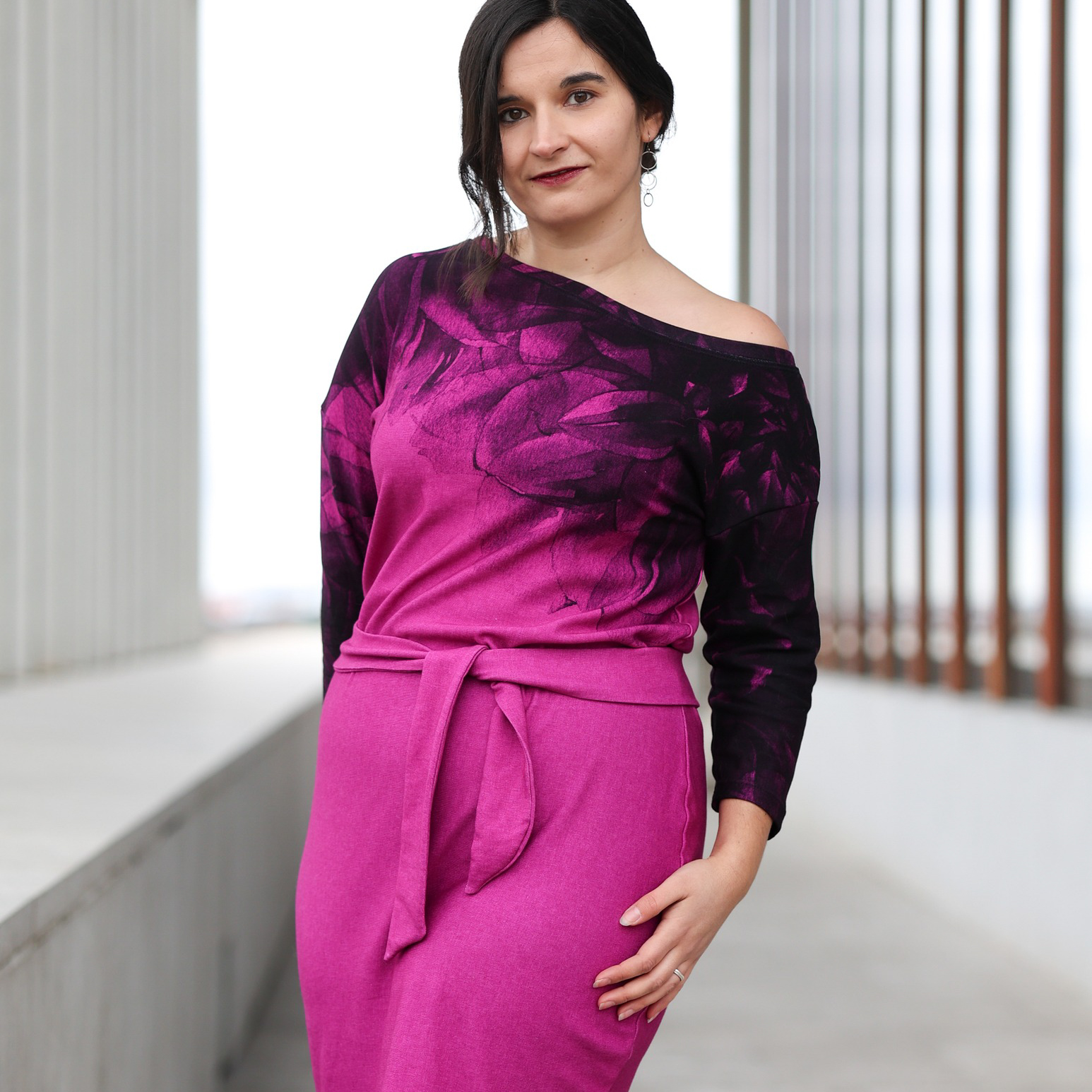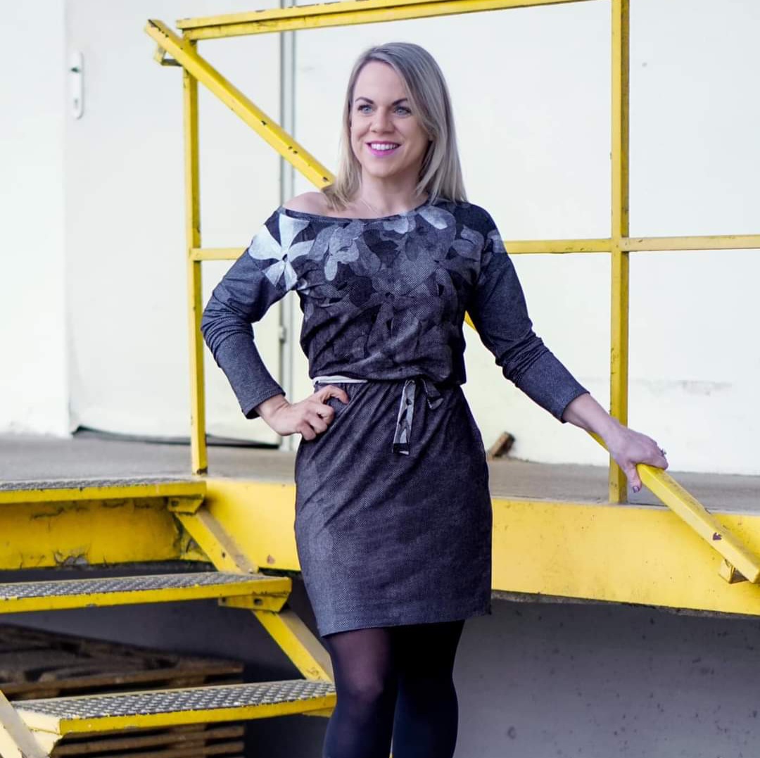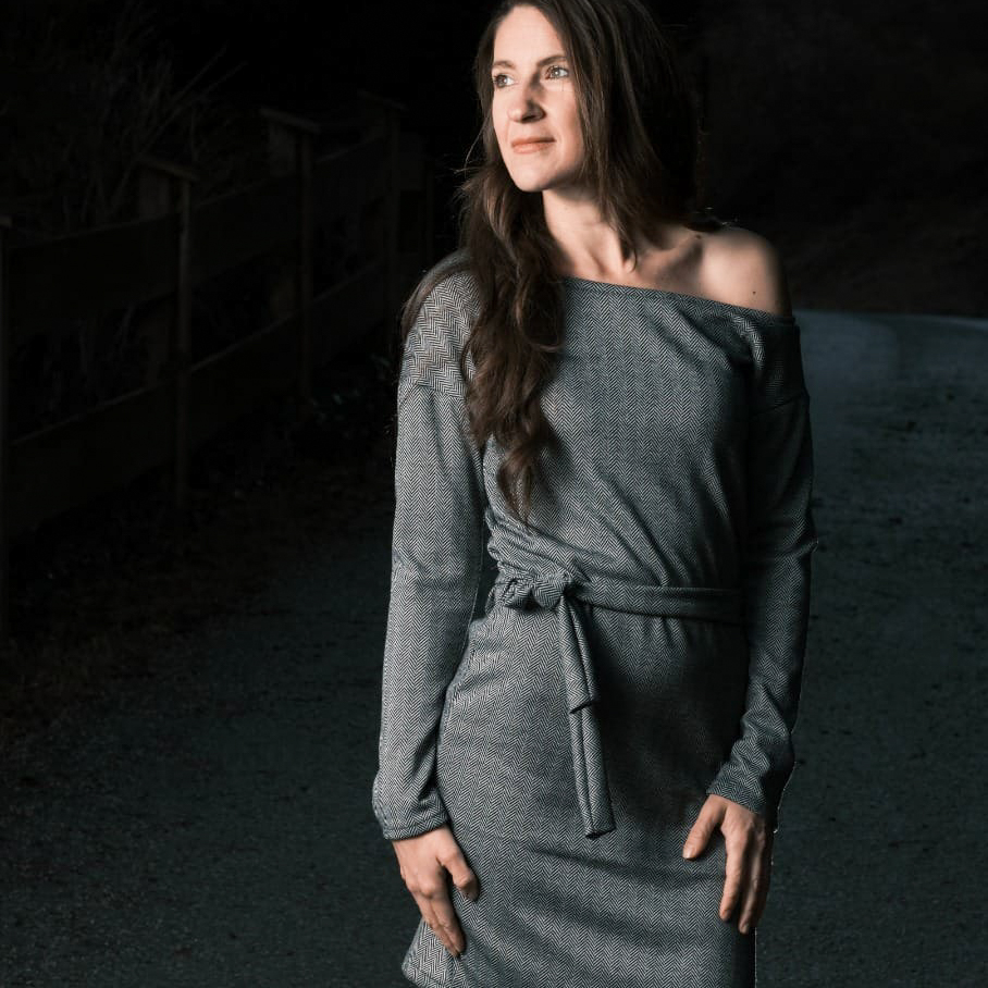 “Pluto” is a quickly sewn, comfortable dress that can be worn in the warm and cold seasons. The special extra is the asymmetry, the dress can be worn off the shoulder on one side. You also have the choice between long and 3/4 sleeves.
