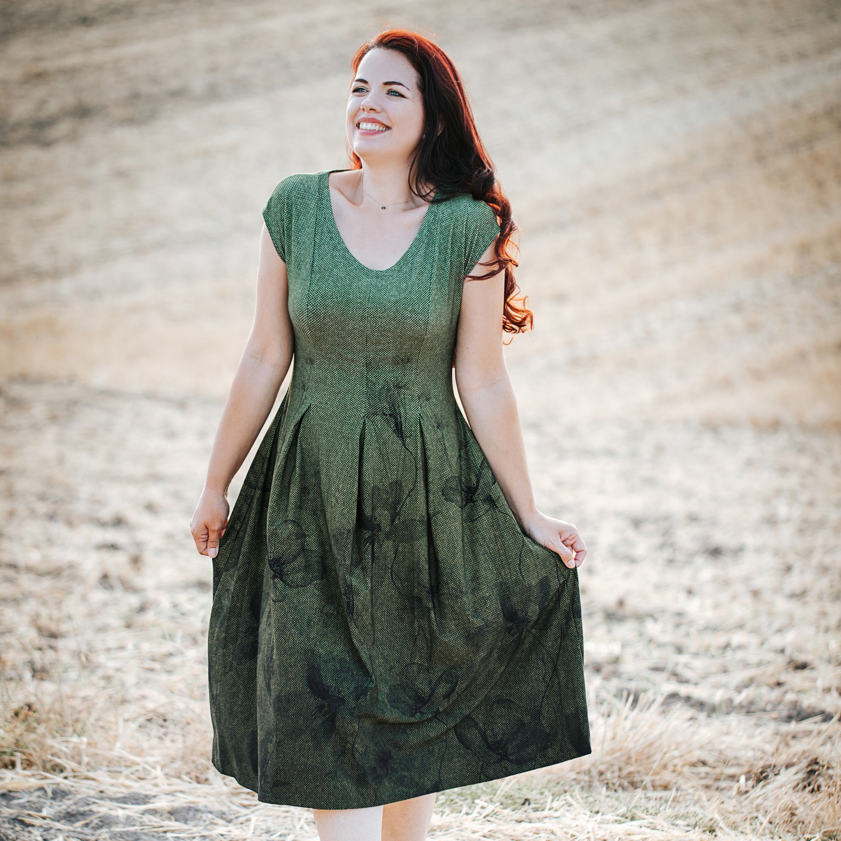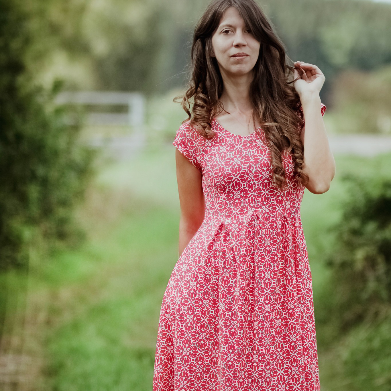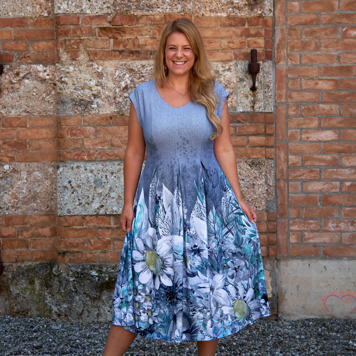 Das Kleid ist ab der Taille durch die Kellerfalten sehr leger geschnitten. Orientiere dich daher bei der Wahl der Größe an deinem Brustmaß und deinem Taillenmaß. Insbesondere in der Taille ist ein genaues Messen wichtig, da hier die Falten aufspringen.
