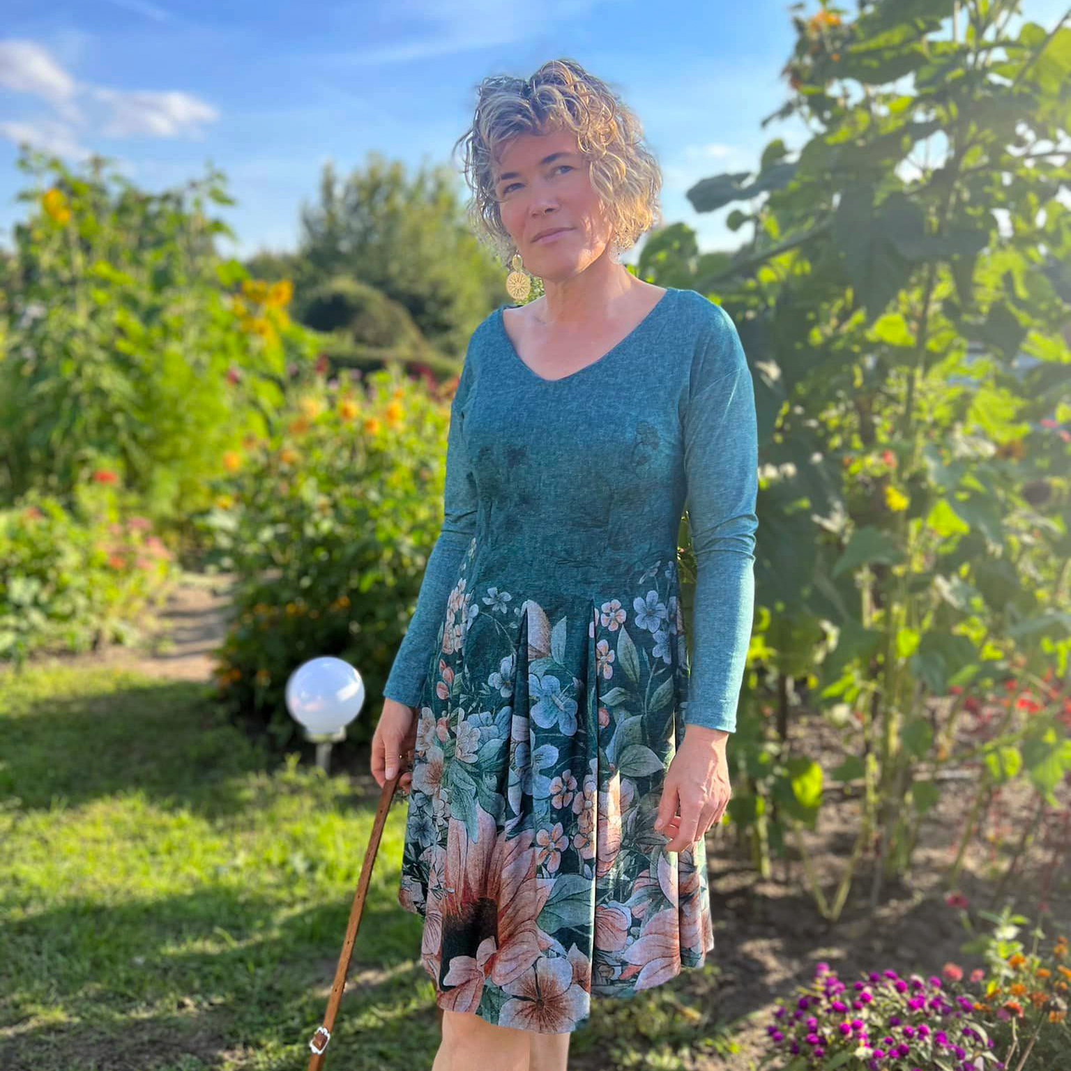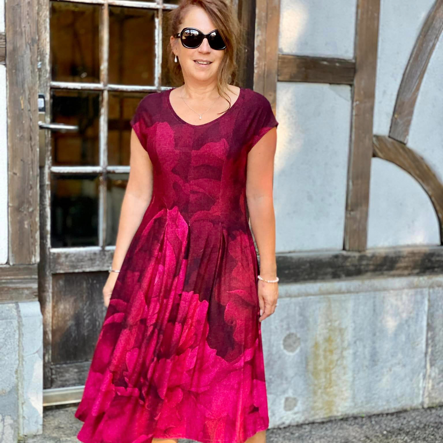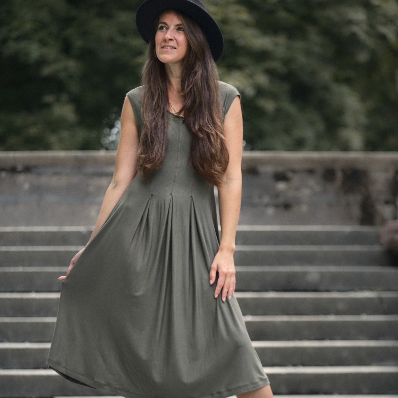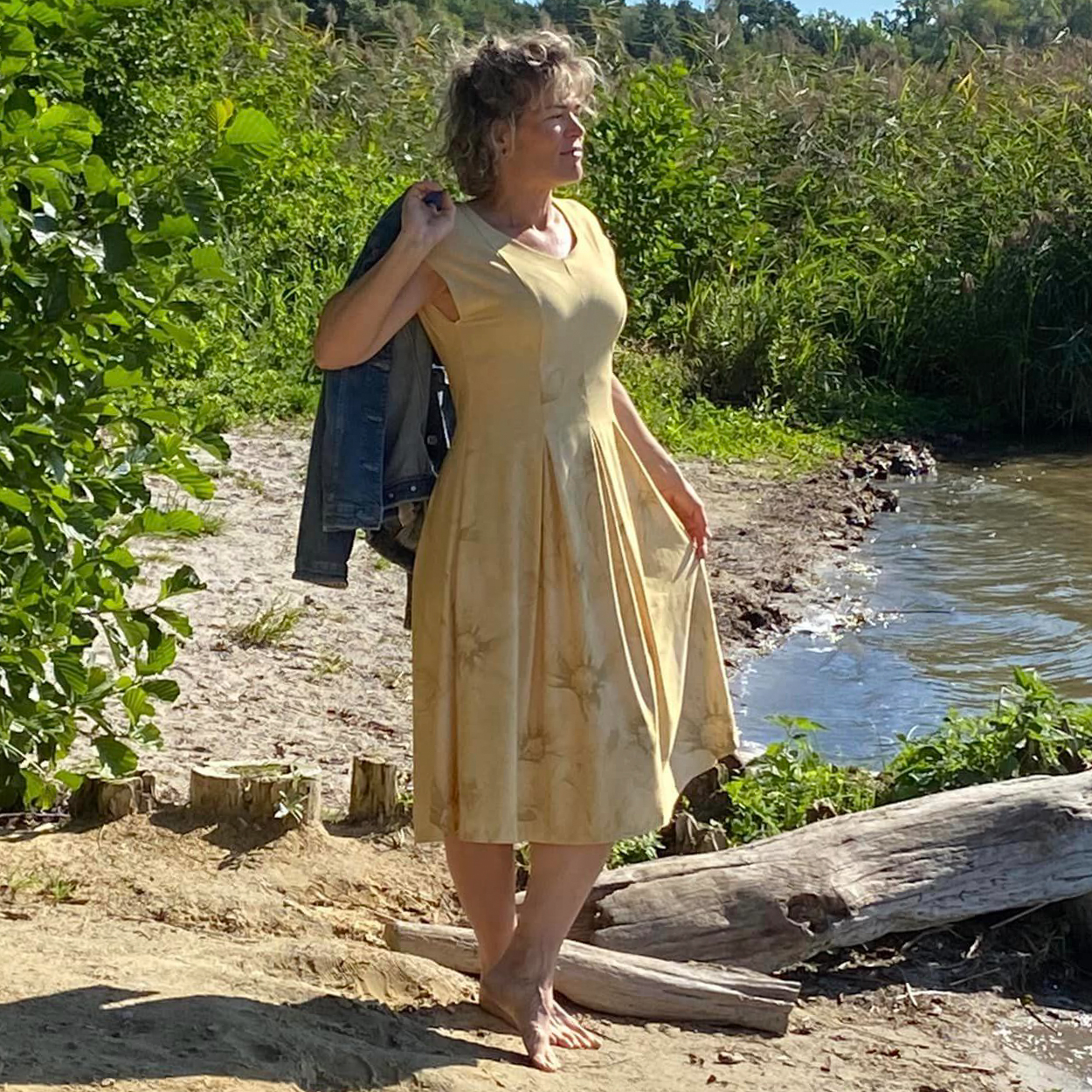 Das Kleid ist ab der Taille durch die Kellerfalten sehr leger geschnitten. Orientiere dich daher bei der Wahl der Größe an deinem Brustmaß und deinem Taillenmaß. Insbesondere in der Taille ist ein genaues Messen wichtig, da hier die Falten aufspringen.