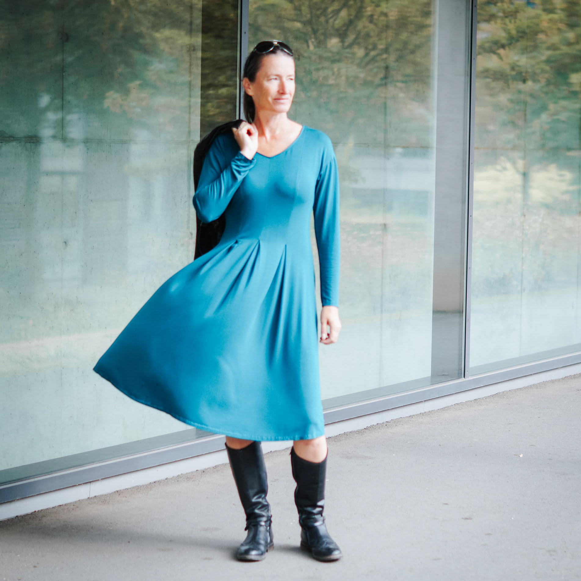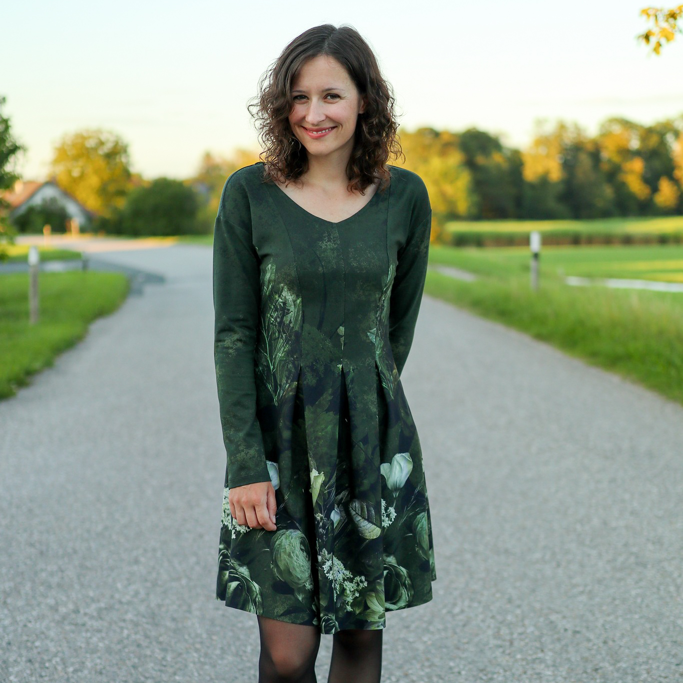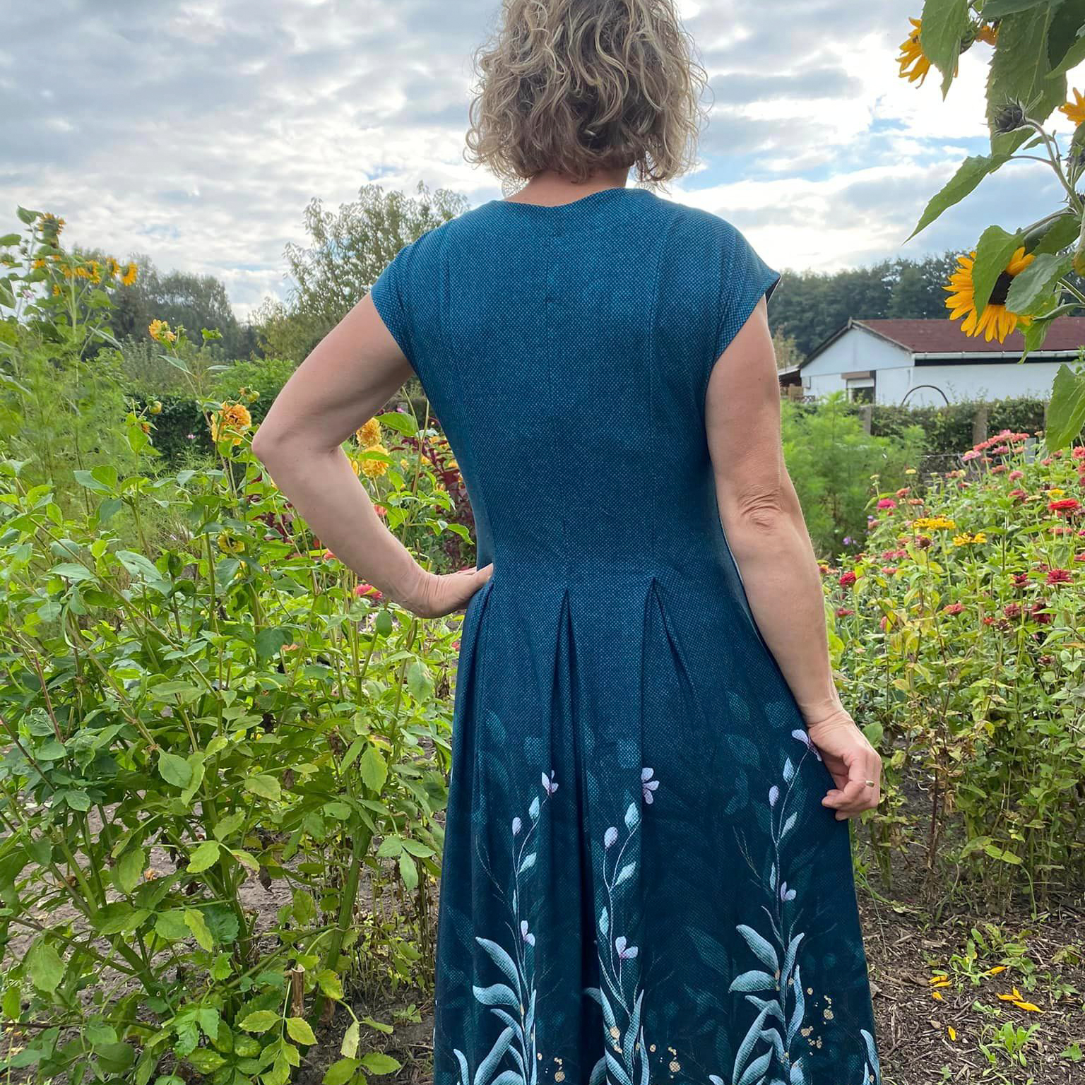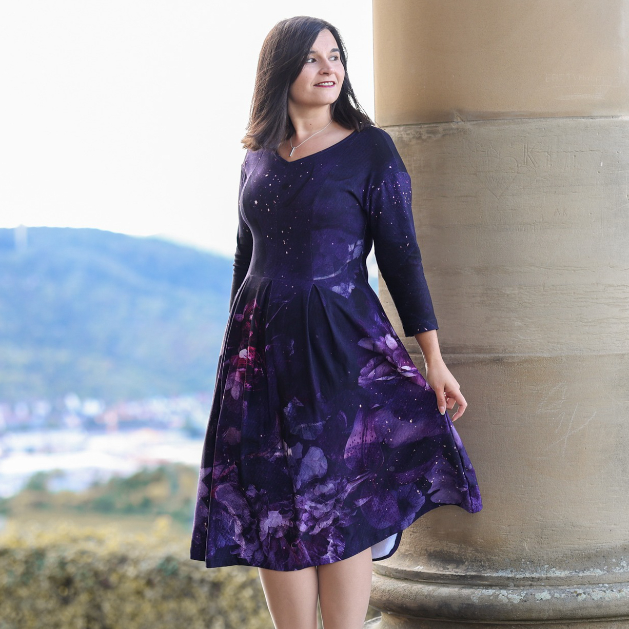 Saturn ist ein sportlich-elegantes Kleid mit jeweils drei tiefen Kellerfalten vorne und hinten. Mit Prinzessnähten und ohne Unterteilung zum Rockteil kommen Bordürenstoffe perfekt zur Geltung. Ihr habt neben 2 Längen auch 2 Ärmelvarianten zur Auswahl: Überschnittene kurze Ärmel und angesetzte lange Ärmel.