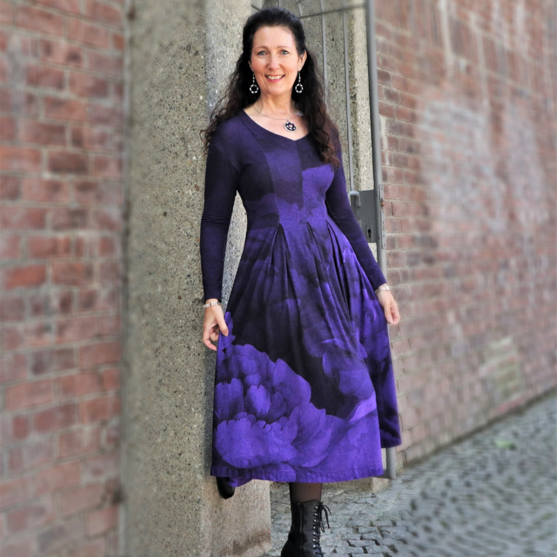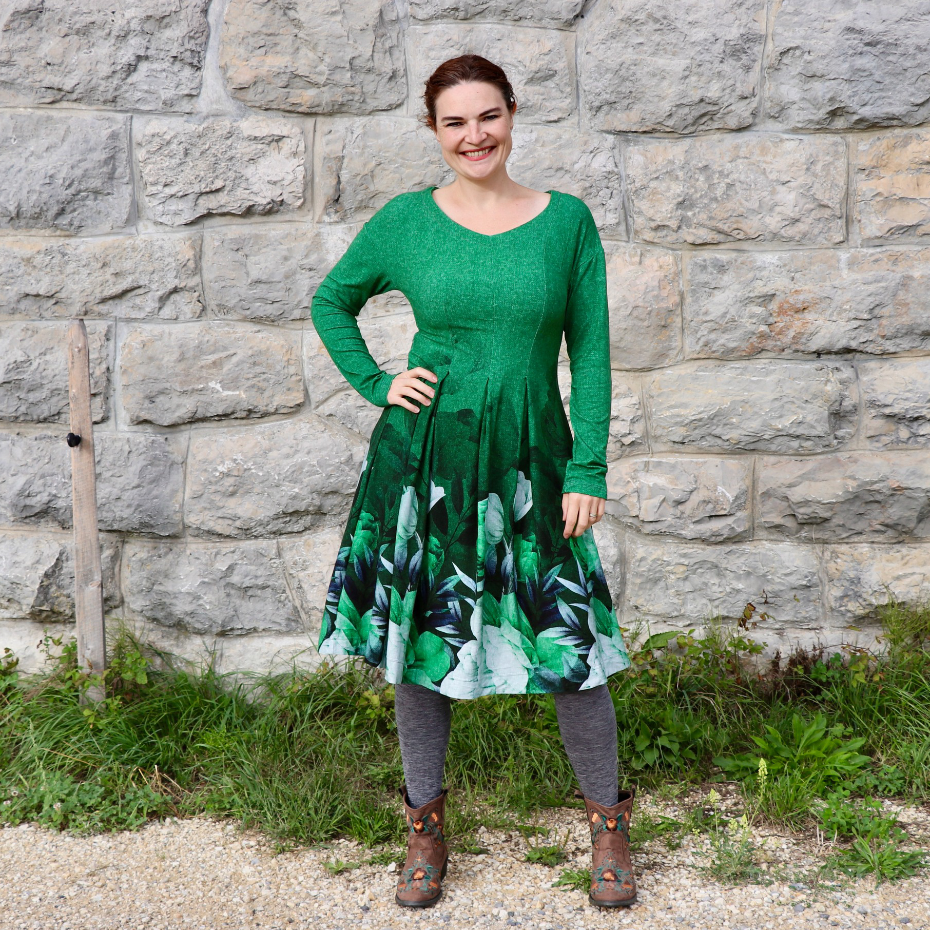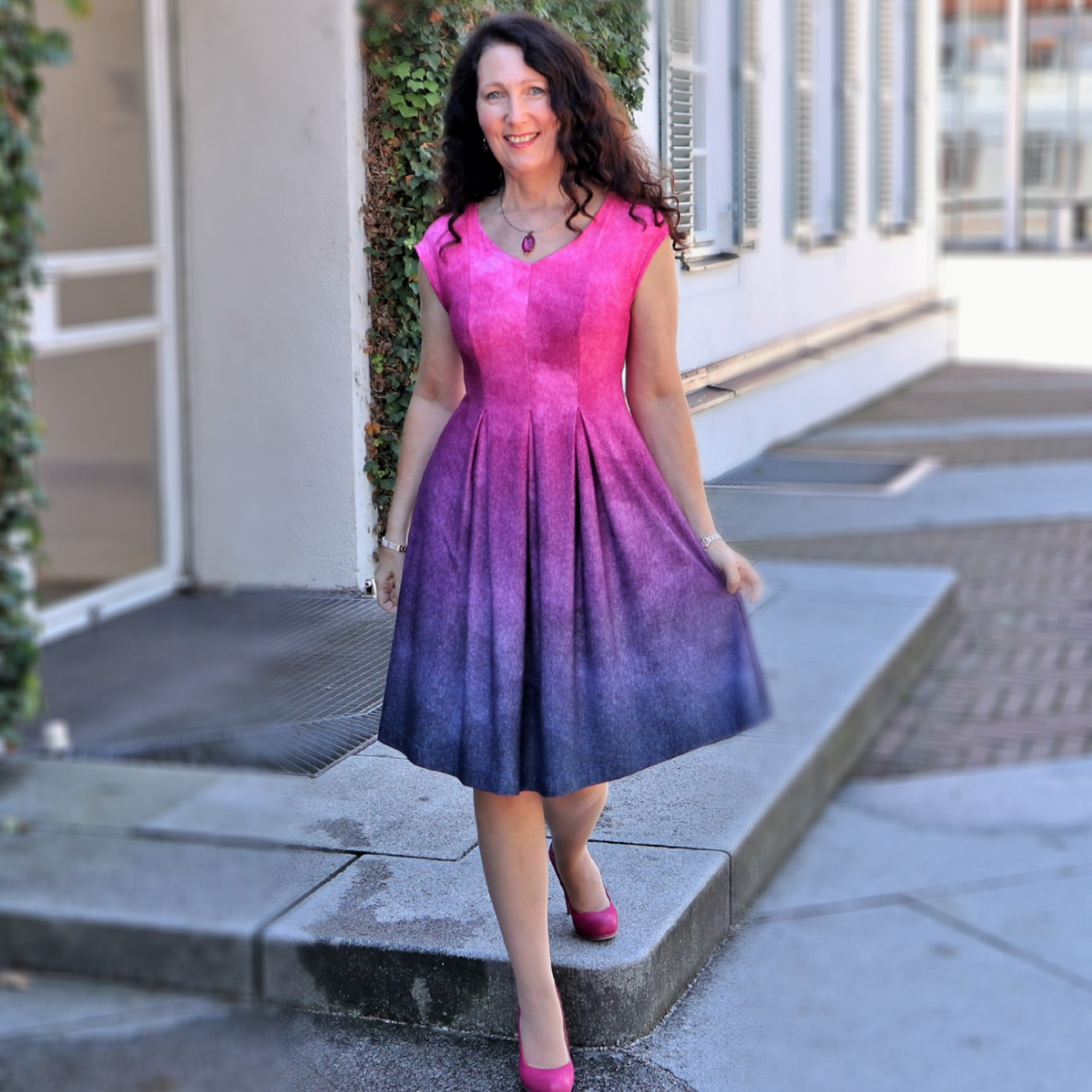 Saturn ist ein sportlich-elegantes Kleid mit jeweils drei tiefen Kellerfalten vorne und hinten. Mit Prinzessnähten und ohne Unterteilung zum Rockteil kommen Bordürenstoffe perfekt zur Geltung. Ihr habt neben 2 Längen auch 2 Ärmelvarianten zur Auswahl: Überschnittene kurze Ärmel und angesetzte lange Ärmel.
