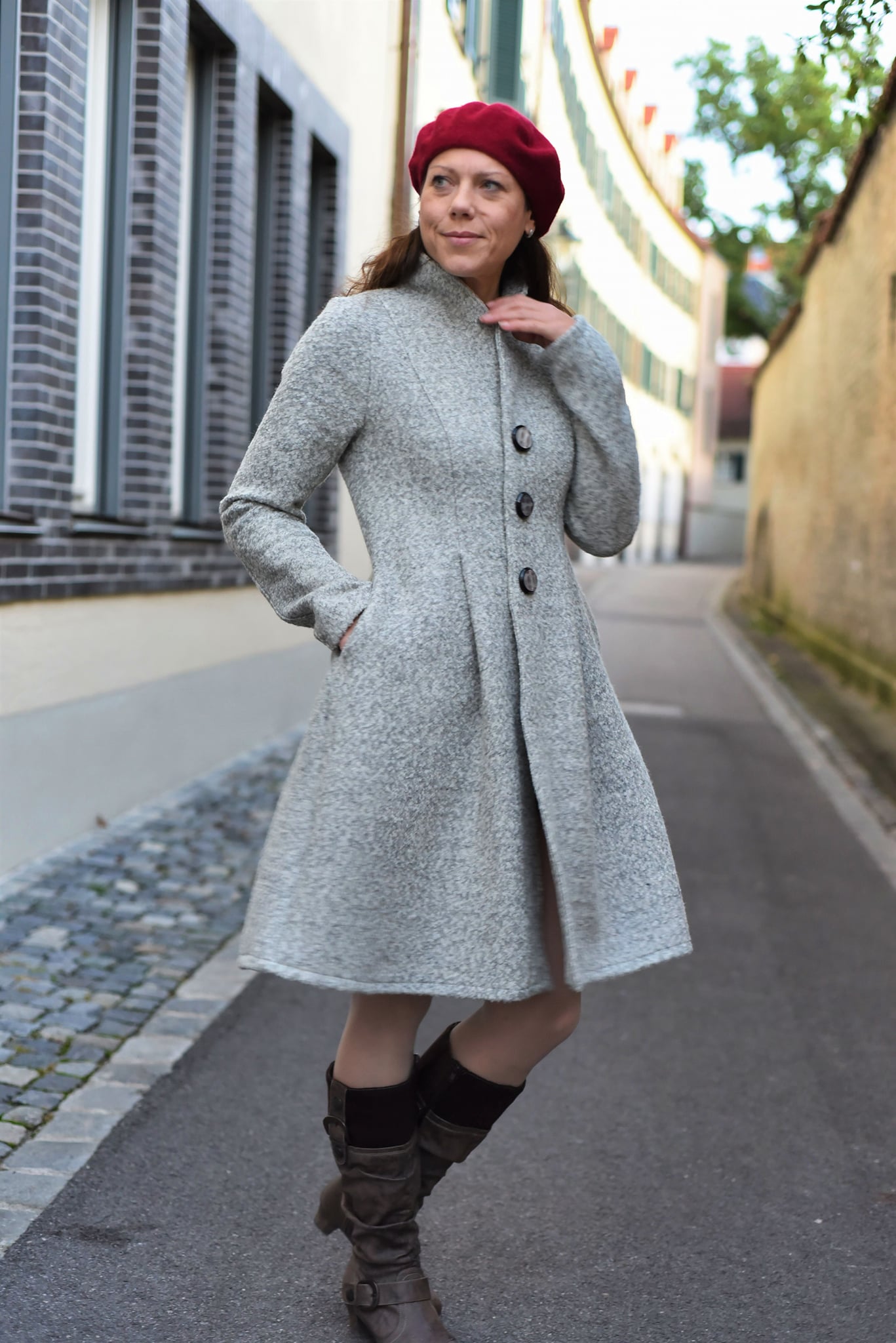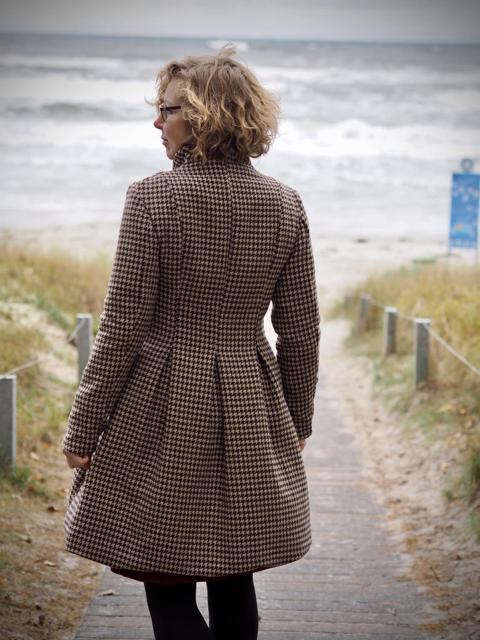 Der Mantel ist ab der Taille durch die Kellerfalten sehr leger geschnitten. Orientiere dich daher bei der Wahl der Größe an deinem Brustmaß und deinem Taillenmaß. Insbesondere in der Taille ist ein genaues Messen wichtig, da hier die Falten aufspringen.