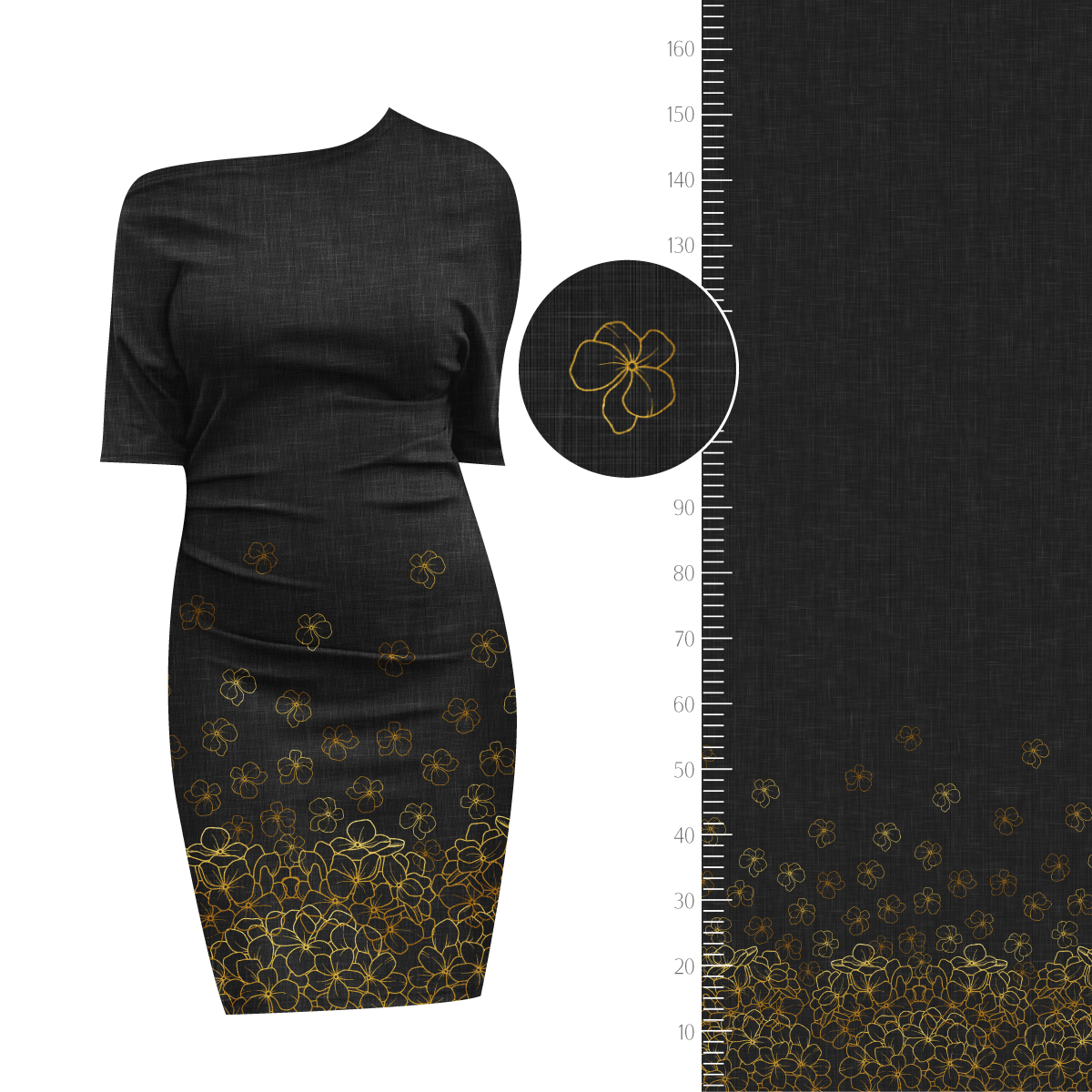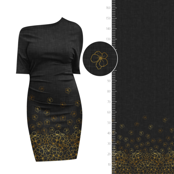 Die Bordüre ist einseitig und bietet genug Raum für kreative Kleidung. Der Fadenlauf ist quer zum Muster, was jedoch kein Problem darstellt, da der Stoff in beide Richtungen gleich elastisch ist und auch in beide Richtungen gleich schön fällt.