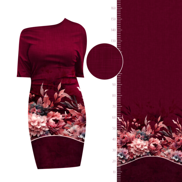 Die Bordüre ist einseitig und bietet genug Raum für kreative Kleidung. Der Fadenlauf ist quer zum Muster, was jedoch kein Problem darstellt, da der Stoff in beide Richtungen gleich elastisch ist und auch in beide Richtungen gleich schön fällt.