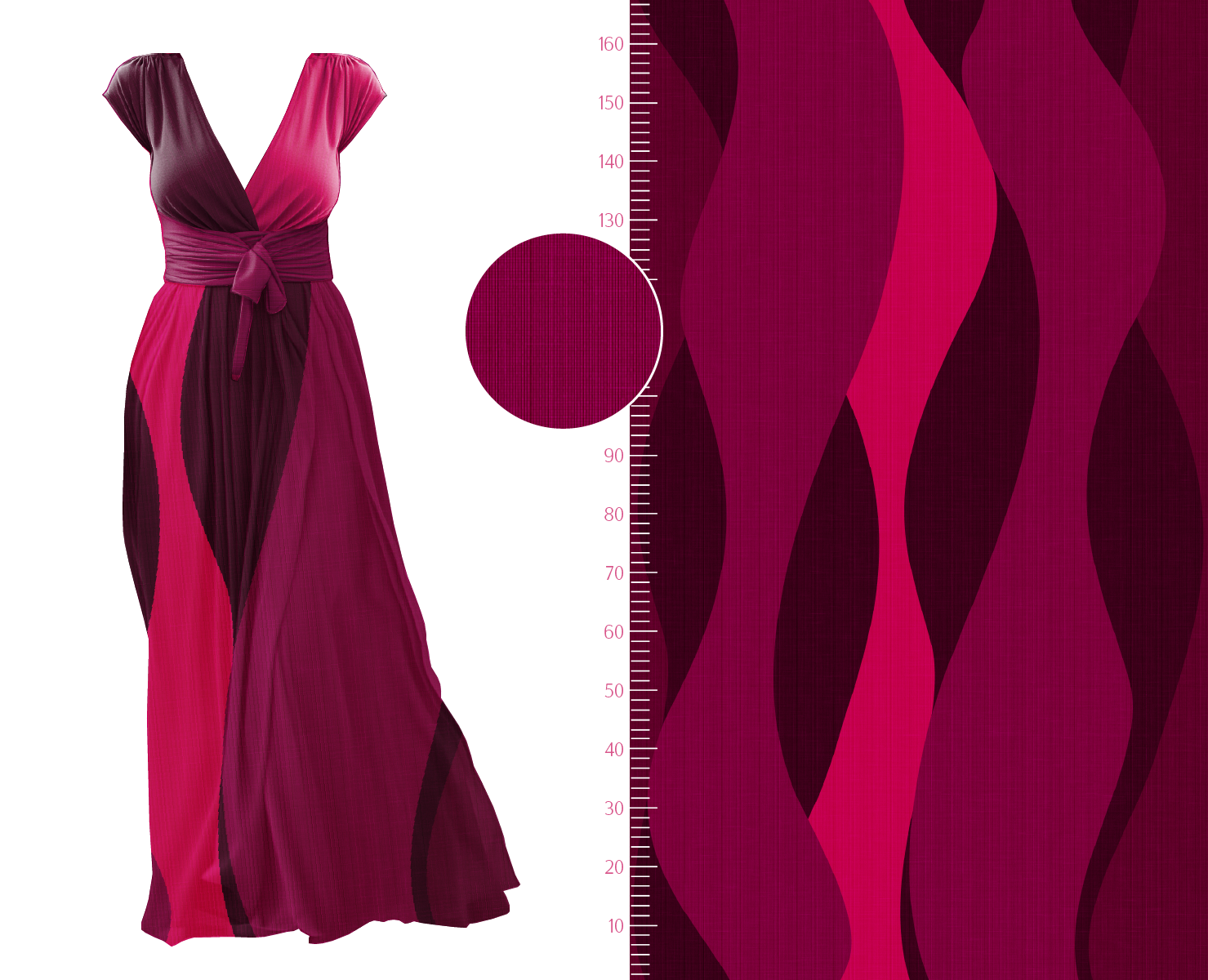Der Fadenlauf der Bordüre verläuft quer zum Muster. Da der Stoff in beide Richtungen gleich elastisch ist und ebenso schön fällt, lässt er sich problemlos in beide Richtungen verarbeiten.